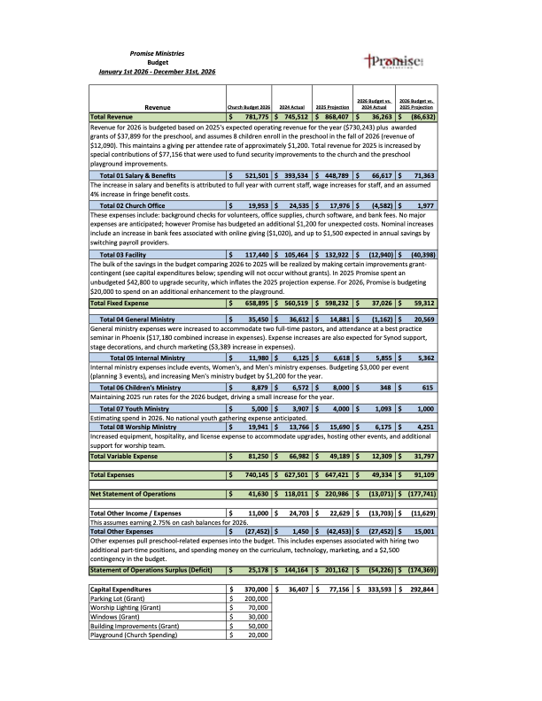 The November 16, 2025 congregational vote for Promise Board of Directors positions and the 2026 budget both passed with simple majority.